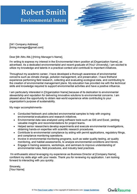 Sample Cover Letter For Environmental Internship . Use our environmental intern cover letter example that highlights job responsibilities, skills & education for your job search. For those in the environmental field, a cover letter is particularly important as it can help you stand out from the competition and showcase your.